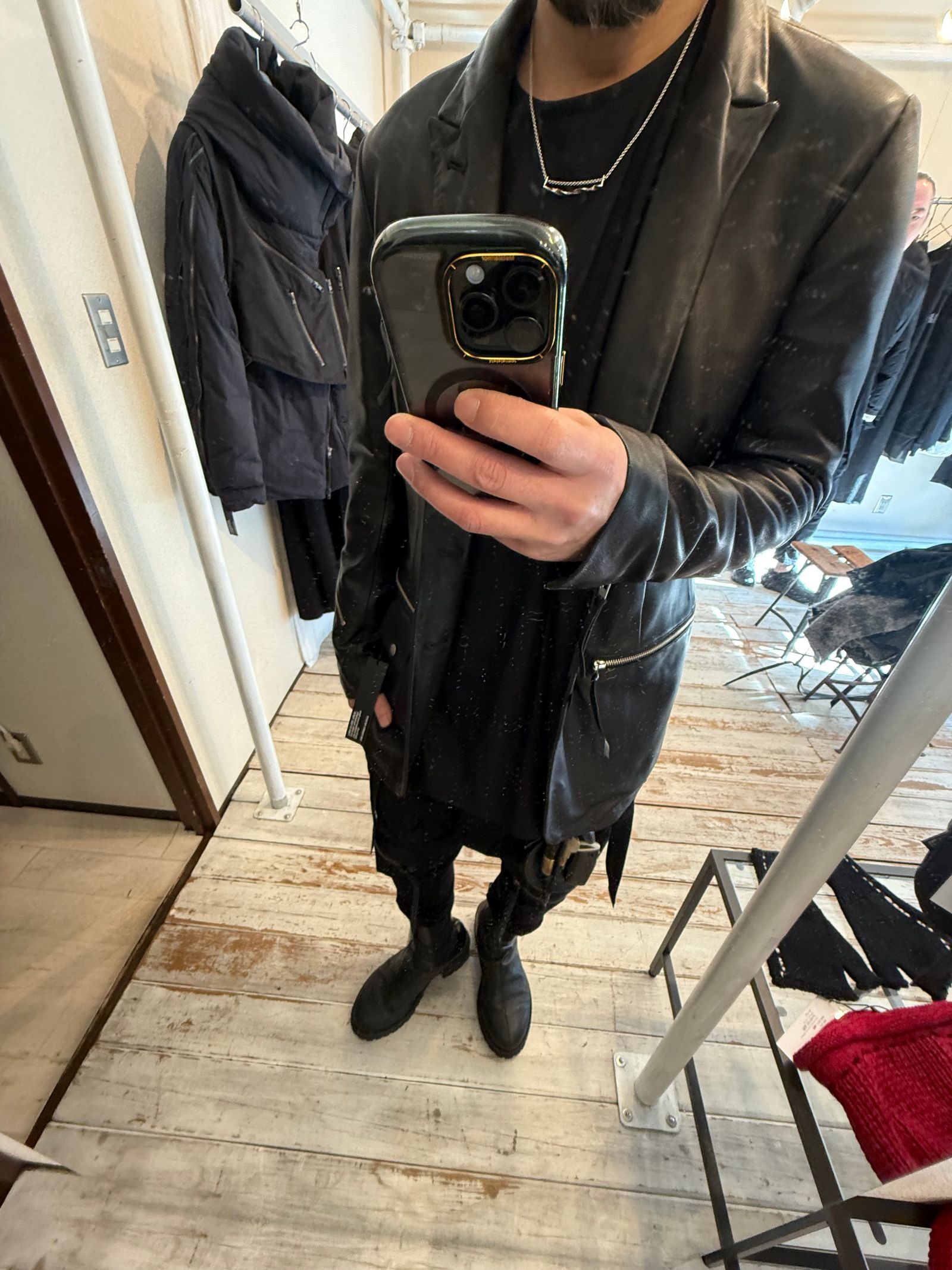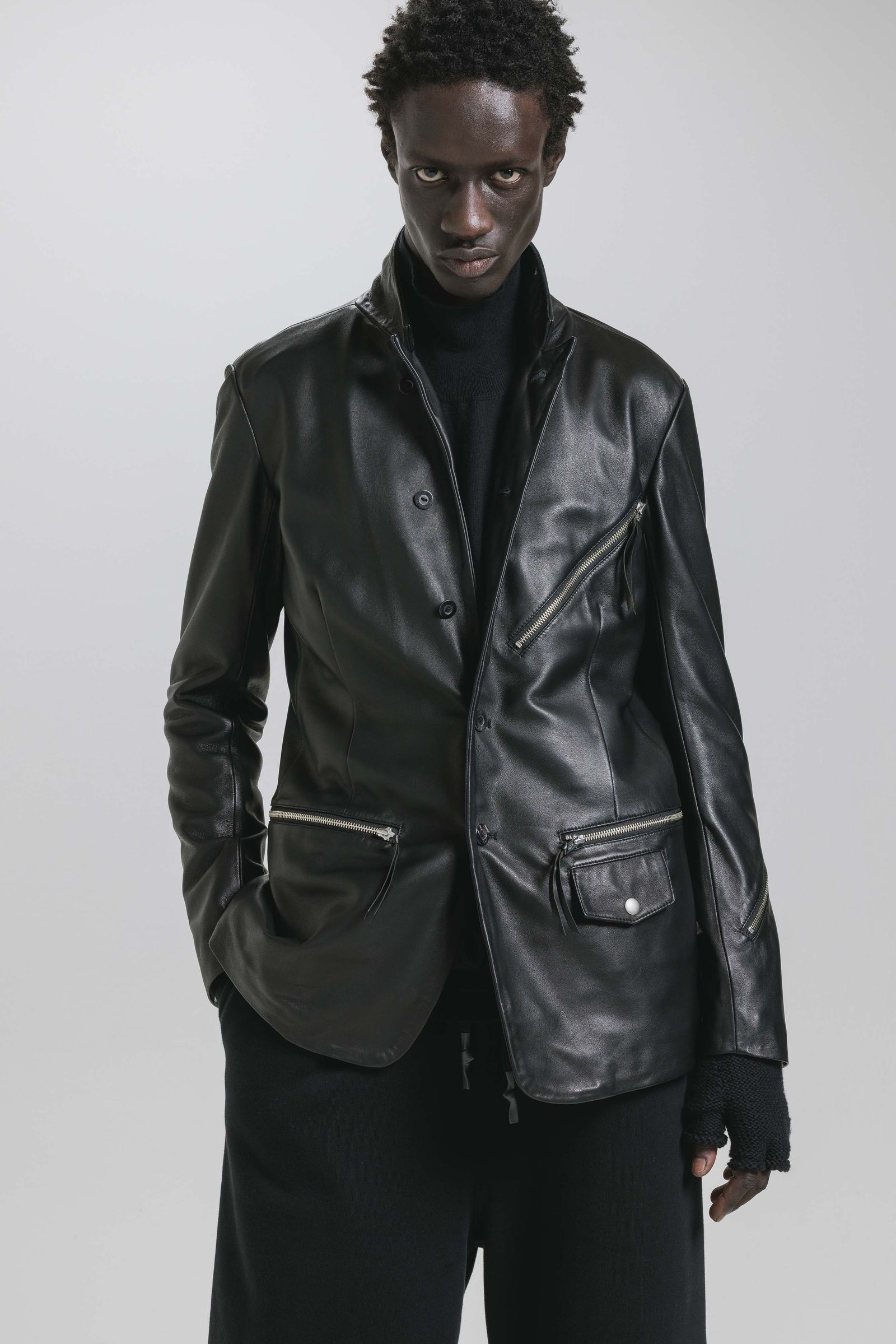 ライダースジャケットのディテールを取り入れたテーラードジャケットも品のあるシープレザーの表情が雰囲気あります。