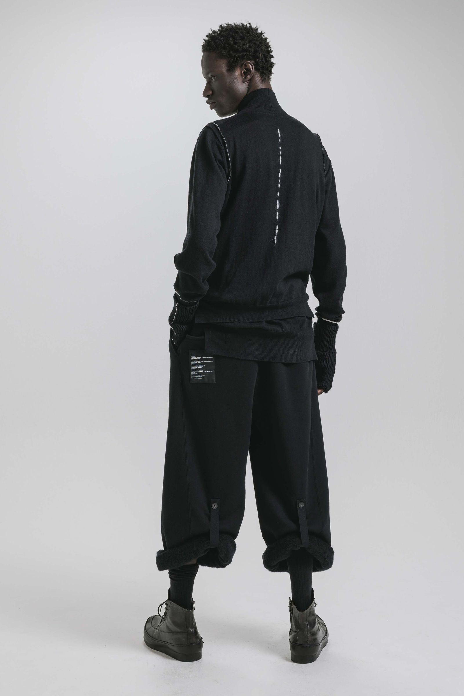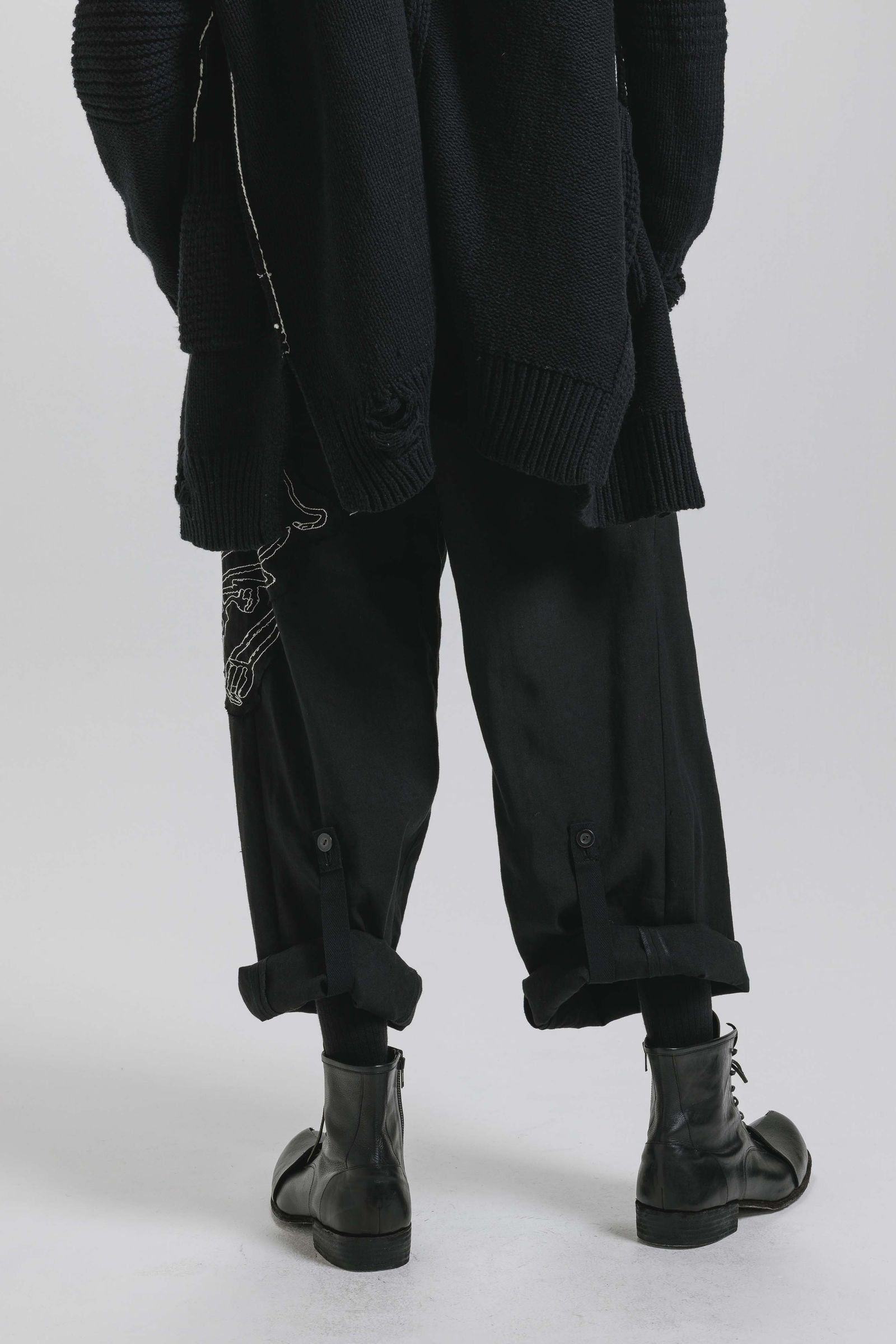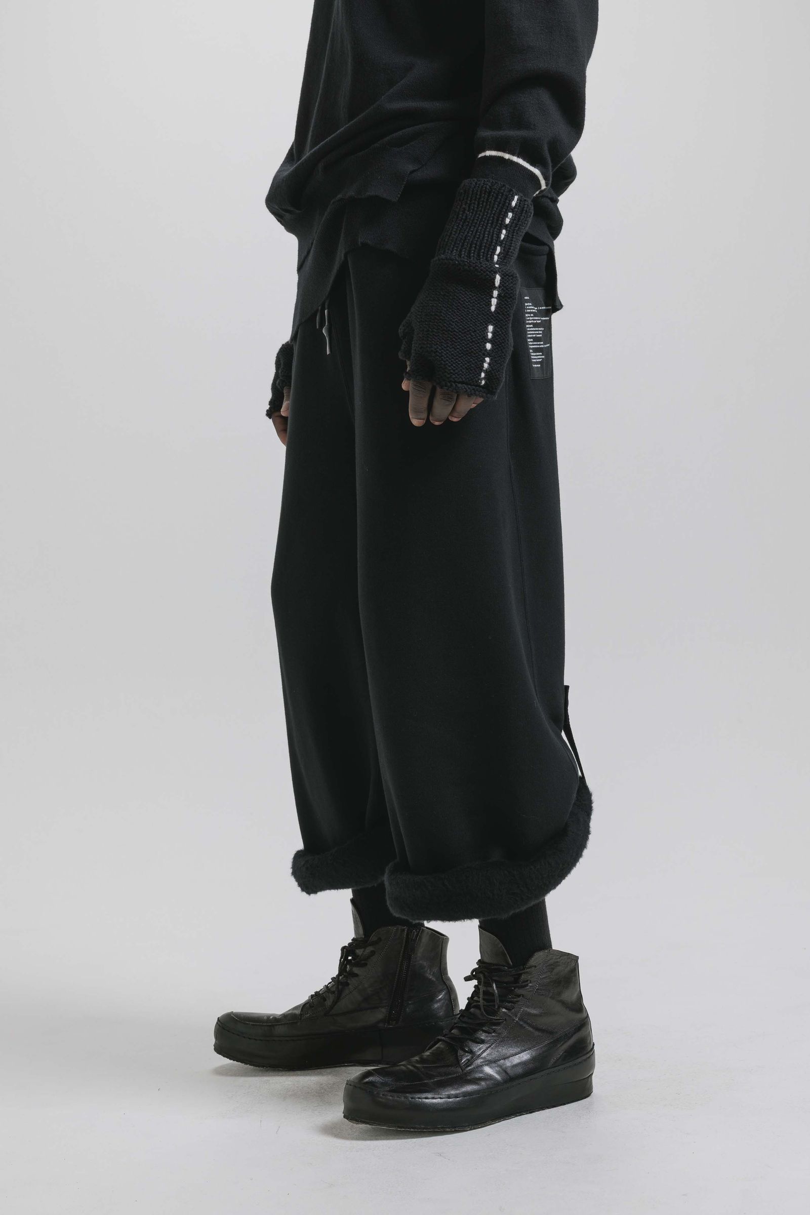 同素材のスウェットワイドパンツはフルレングスですが、裾をロールアップし、付属のテープ/ボタンで固定する事でクロップド丈でも着用が可能。