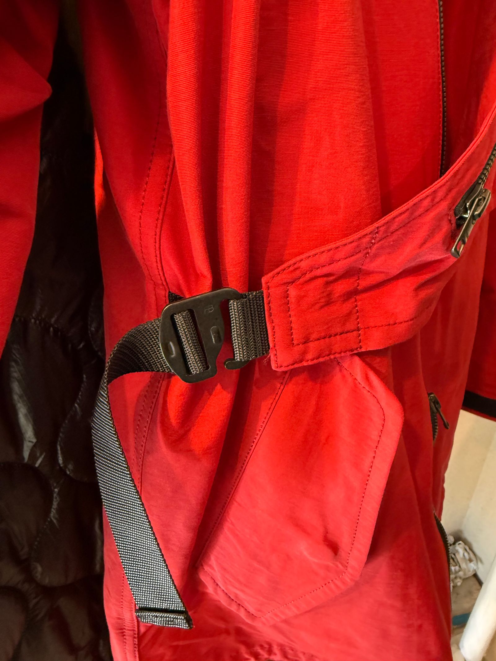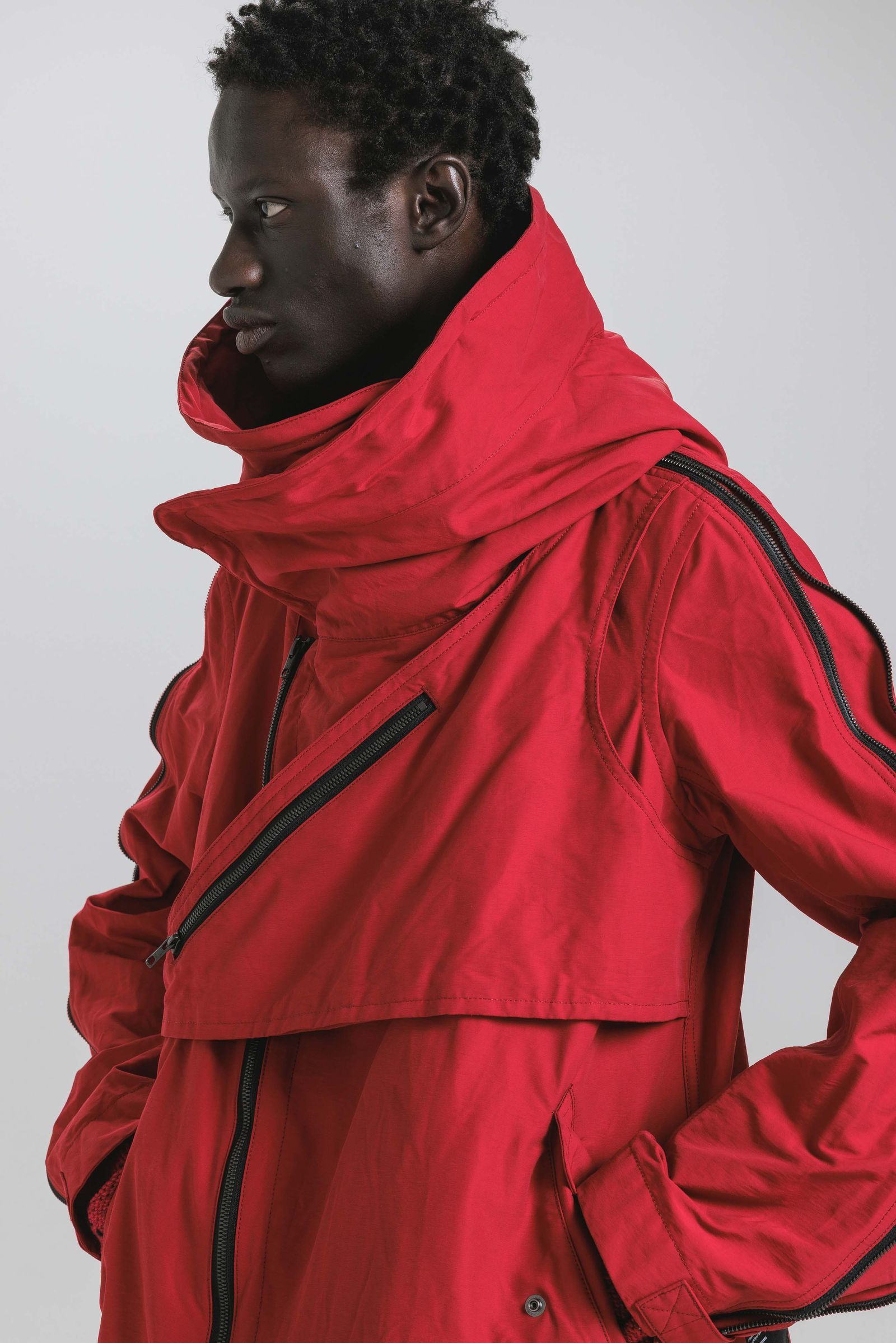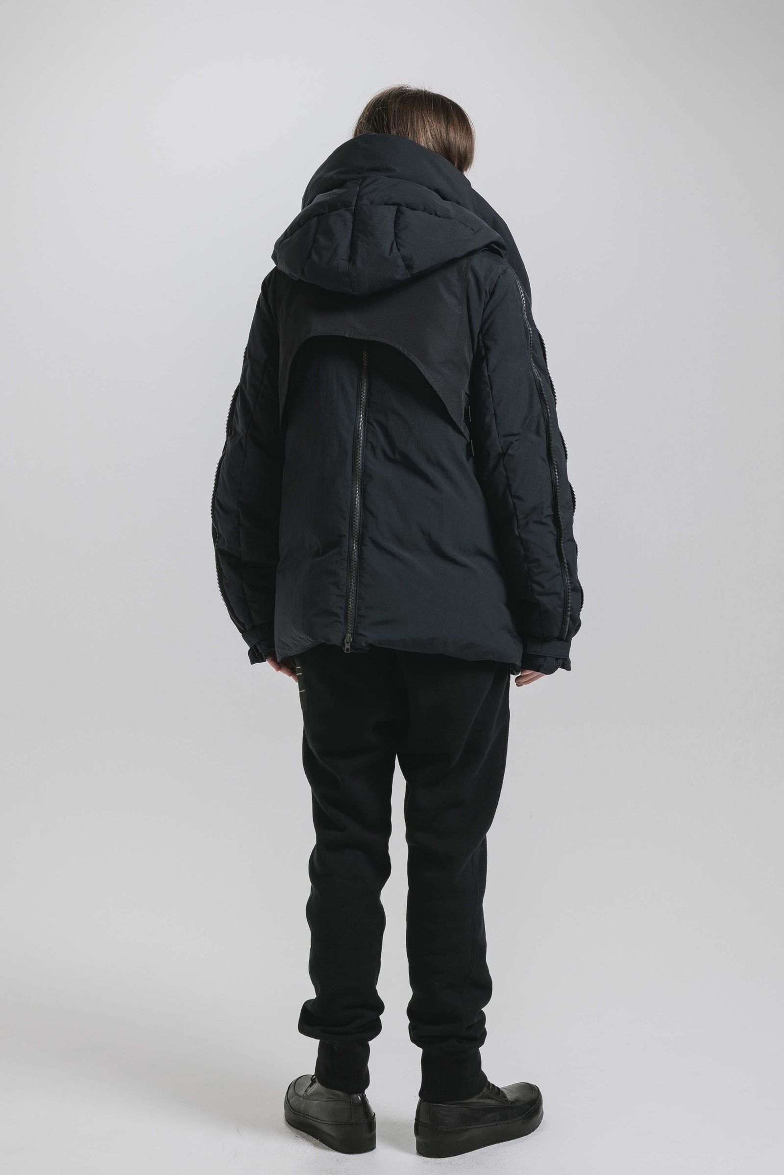 マルチジップ仕様で背中心、アーム部分のファスナーで身幅、袖幅の調整も可能。