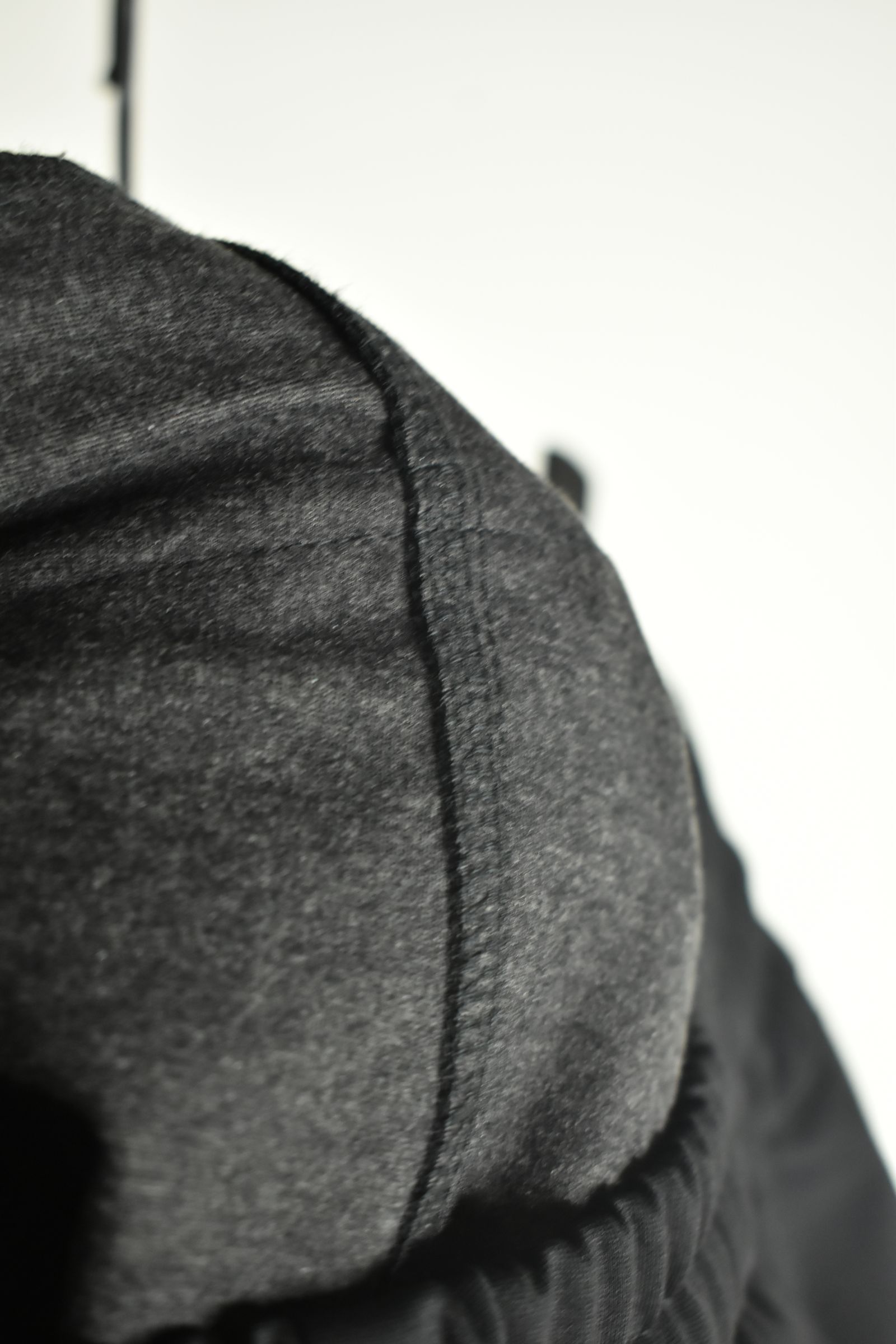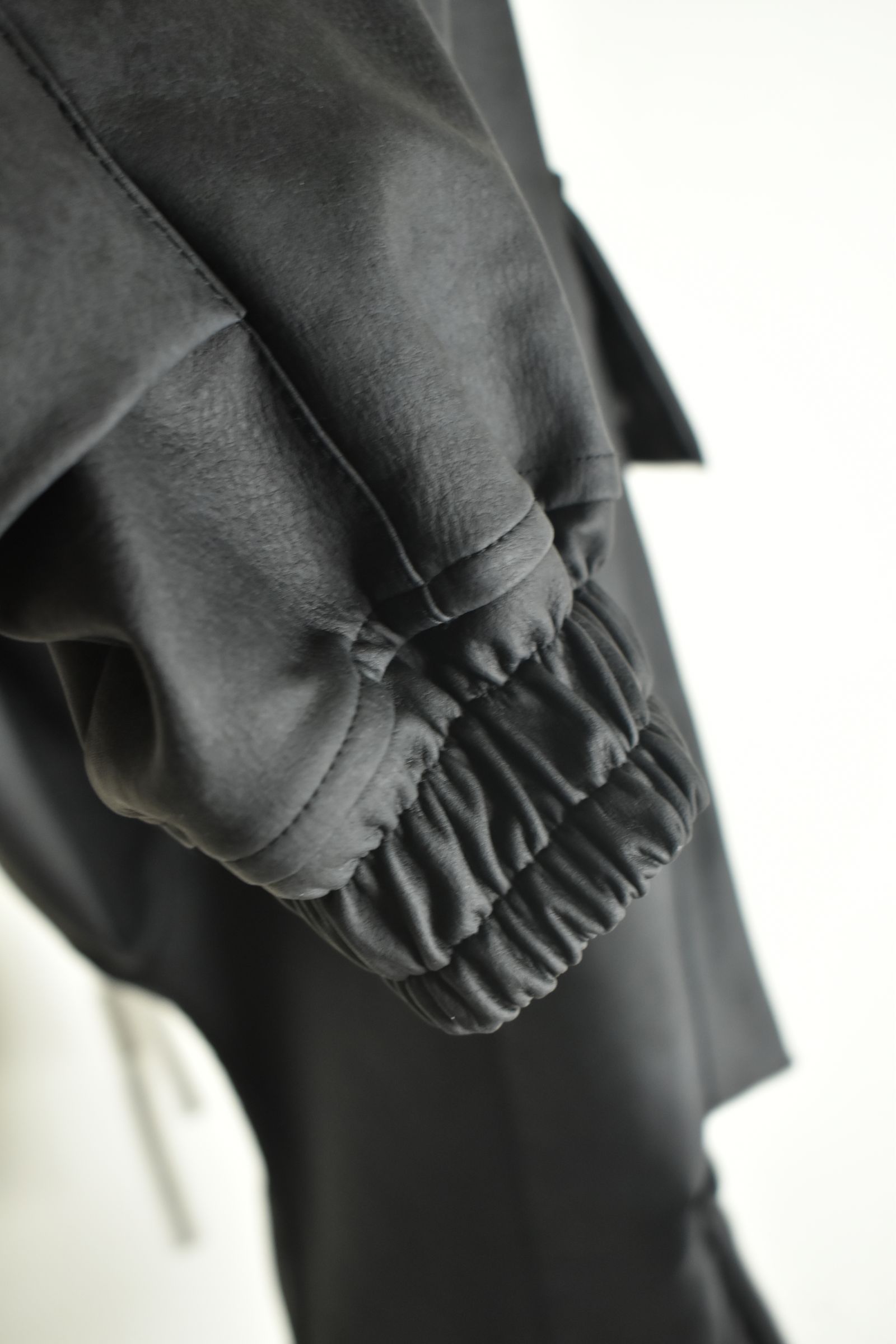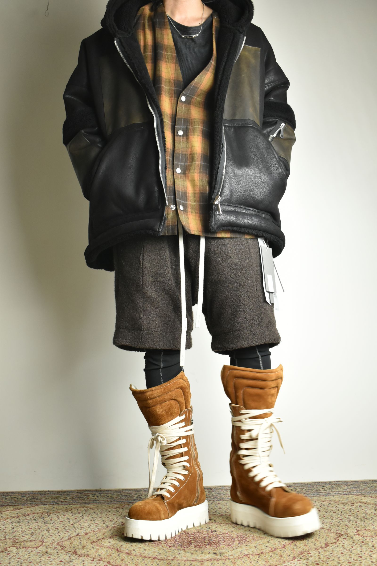 フェイクムートンとヴィーガンレザーの切り返しで裏地は総ボアのフーディブルゾン。
