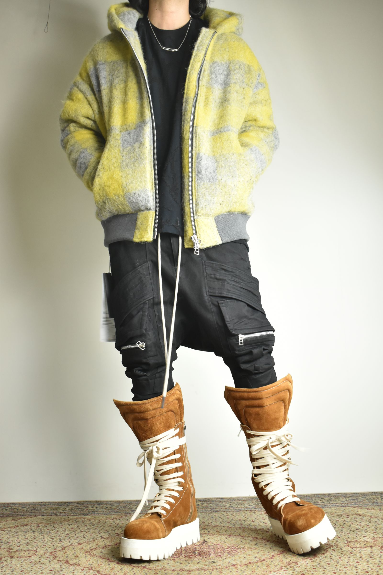 大判なイエロー×グレーのチェック柄の中綿入りフーディブルゾンは華のある配色がポイント。