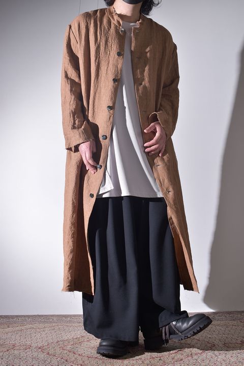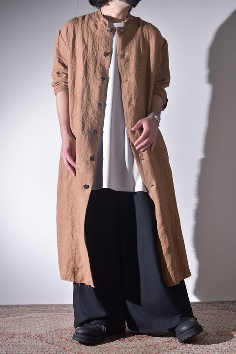 kujaku 2025SS リネン素材を使用した柿渋染のロングシャツコートに同ブランド、ワイドシルエットのイージーパンツでコーディネート。
